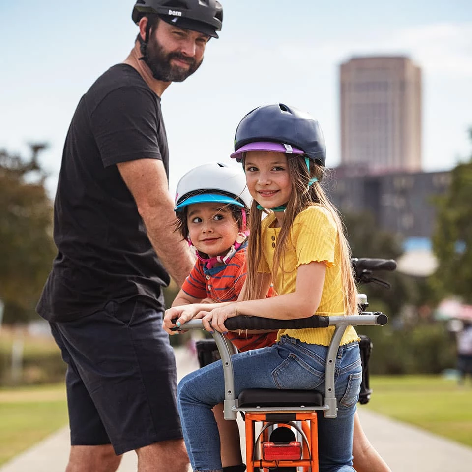 Offrez un espace sécurisé et plus de liberté à vos enfants à l’arrière de votre vélo. Et si l’un d’eux à encore besoin du siège, pas de problème, tout est compatible.