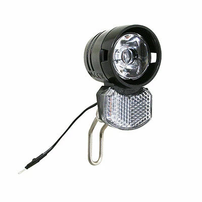 Ce phare avant de vélo Axa assure la visibilité du cycliste et éclaire la route par faible luminosité. D’une intensité lumineuse de 15 lux, l’éclairage est fourni par une LED puissante de 2.4W. Le feu Ecoline s’alimente par dynamo, dynamo dans le moyeu ou dynamo sur roue. Il est livré avec le câble à brancher sur l’alimentation. Pour une meilleure visibilité, même de jour, il intègre un réflecteur blanc situé juste en dessous de l’éclairage.