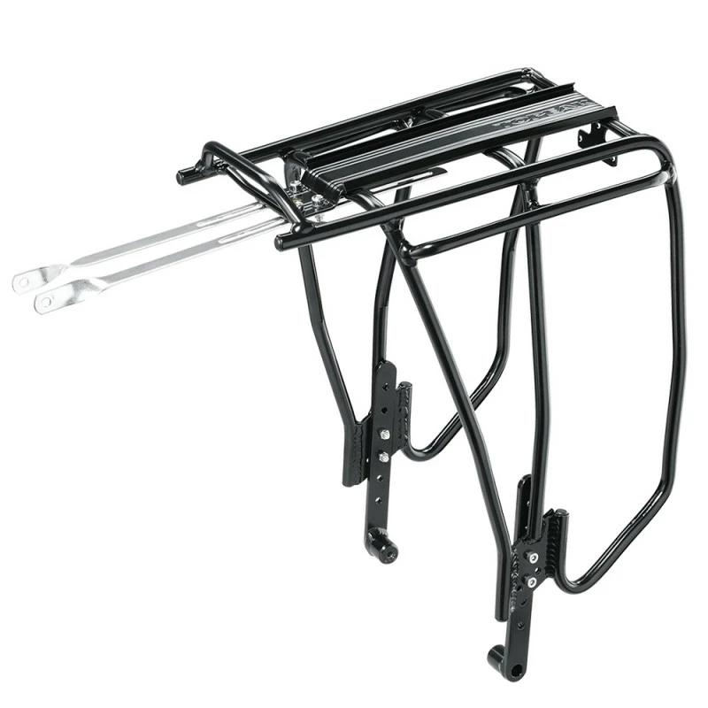 Grâce à ses pattes de fixation inférieures adaptables, il s’installe sur les VTT au format 24 ou 26 pouces, à freins à disque. Ces pattes s’orientent à l’horizontale ou à la verticale. Il s’adapte ainsi sur de nombreux modèles, sauf ceux qui présentent un cadre avec des bases asymétriques. Les bras supérieurs se fixent sur les points filetés des haubans.