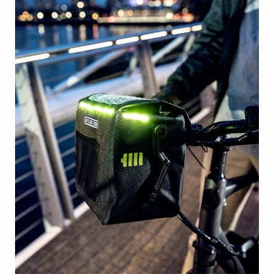Autre particularité, la sacoche de guidon Ortlieb E-Glow mise beaucoup sur la sécurité et la visibilité du cycliste. Un grand bandeau lumineux de LED amovible par clips est disposé à l’avant et sur les côtés de la sacoche augmentant grandement la signalisation du cycliste pendant la nuit ou par faible luminosité. L’intérieur de la sacoche est également éclairée, permettant de trouver facilement un objet précis dans l’obscurité. L’alimentation électrique des LED se fait soit par l’écran du vélo électrique fonctionnant grâce à la batterie, ou bien via un banc de puissance, tous deux reliés par connexion USB. Retrouvez la sélection de piles et de batteries pour VAE.