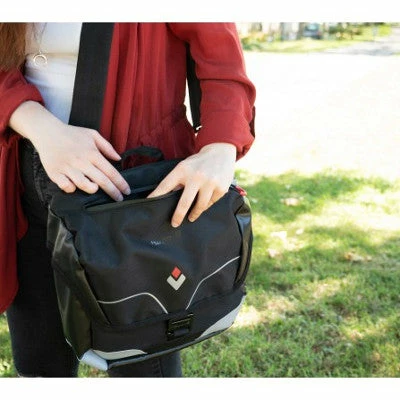 Une fois descendu du vélo, la sacoche se transporte tout aussi aisément grâce à sa lanière détachable et ajustable, ainsi qu’une anse de transport.