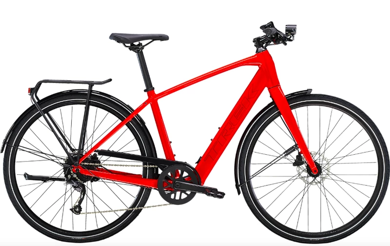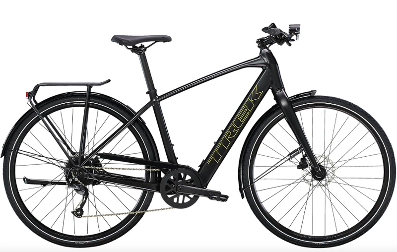 A lightweight aluminum frame and fork, Trek’s proprietary pedal assist system with a hub motor (250W, 40Nm) that assists up to 20 mph and a 250Wh battery for a range of up to 35 miles per charge. Plus, fast 700c wheels, fast-rolling yet stable 40c tires with reflective sidewalls, a reliable 9-speed Shimano drivetrain, hydraulic disc brakes, integrated lights powered by the battery, a MIK-compatible rear rack, fenders, and a kickstand.